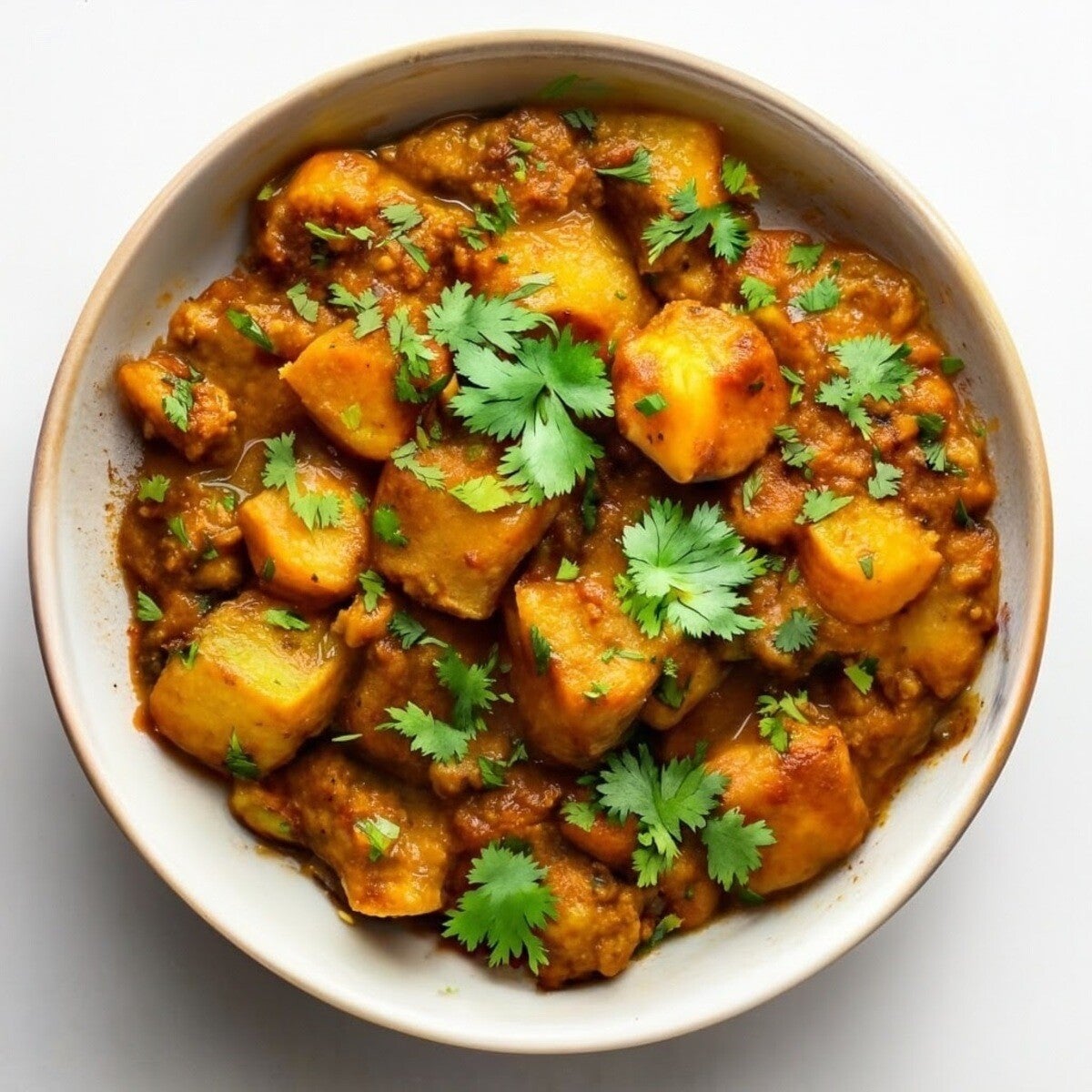 gebratene Kartoffeln mit indischen Gewürzen und Currysauce